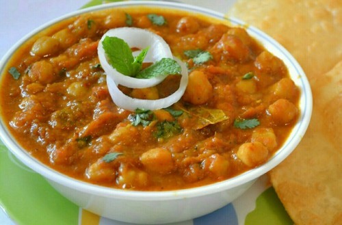 Garbanzo beans cooked with freshly ground spices, onion and tomatoes.