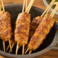 LAMB SEEKH KABAB Minced lamb seasoned with lamb, garlic, onion, spices and grilled on skewers in a Tandoor.