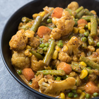 Mixed vegetables mildly spiced and cooked with raisins, cashews and spices in a rich creamy yogurt sauce.